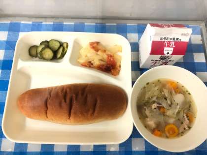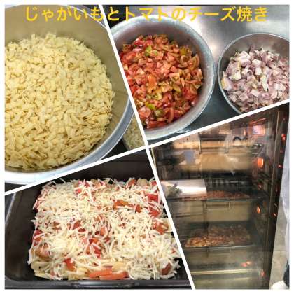 今日の給食は、鶏肉とてぼ豆のスープ煮、じゃがいもとトマトのチーズ焼き、きゅうりのサラダ、黒糖パン、牛乳です。チーズ焼きは、塩、こしょうで下味をつけたベーコンとじゃがいもに、トマトを混ぜ合わせ、チーズをのせ、180度のスチームコンベクションオーブンで30分間焼きます。じゃがいも、トマト、チーズの相性がとてもよく、香ばしく焼かれているのでおいしいです。子ども達にも人気があり、よく食べていました。