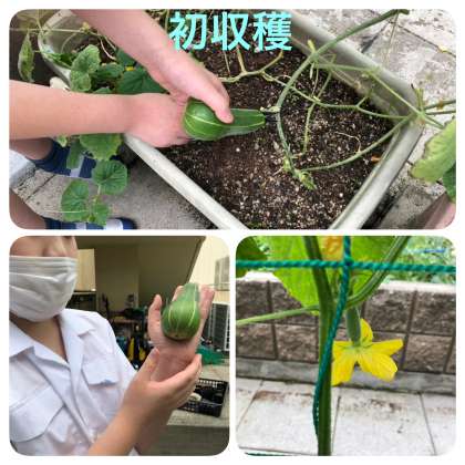 給食委員会では、なにわの伝統野菜である玉造黒門越瓜を栽培しています。今日、初収穫の日を迎えました。昨年に比べて雨の日が多く、太陽の光が足りなかったのか、たくさん実がつかず、ようやくついた実も手のひらサイズの小さなものでした。これ以上収穫せずにいると、虫に食べられそうだったので、小さいまま収穫しました。給食委員会の児童は、自分が栽培した瓜を収穫することができて喜んでいました。この喜びは小さくても関係ないようです。酢の物や漬物、白玉だんごなど、様々な料理法があるので、家に持ち帰って味わってほしいです。次の雌花も咲いてきているので、次の瓜が収穫できるのを楽しみに待ちたいと思います。