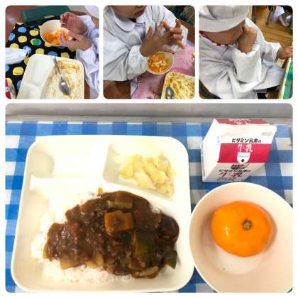 今日の給食は、夏野菜のカレーライス、キャベツのサラダ、冷凍みかん、牛乳です。夏野菜のカレーライスには、かぼちゃやなす、トマト(缶)、ピーマンなどの夏野菜がたくさん入っていました。苦手な野菜でもカレーだと食べやすいようで、子ども達はおかわりをしてもりもり食べていました。冷凍みかんは、1年生にとっては初めて給食で食べます。毎年、なぜか冷凍みかんが給食に登場する時は、天気が悪いことが多いです。本来なら、暑い夏に喜んで冷たいみかんを食べられればよかったのですが、今日は、ブルブルとふるえながら食べている子ども達もいました。「頭がキーンとする」と言って頭をおさえながら食べている人や、直接手でさわらずにスプーンで食べている人など、様々でした。