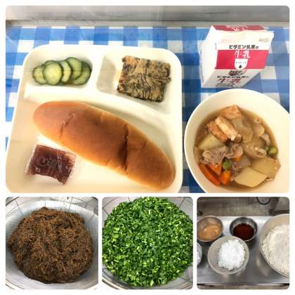 今日の給食は、もずく入りヒラヤーチー、豚肉とあつあげの煮もの、あっさりきゅうり、コッペパン、いちごジャム、牛乳です。ヒラヤーチーは、沖縄県の家庭料理です。「ヒラ」は平たく、「ヤーチー」は焼くという意味があります。卵、水、片栗粉、かつおぶし、にら、もずくなどを混ぜ合わせ、うすくのばして焼き、給食室で切り分けています。みりん、米酢、こいくちしょうゆで作ったたれをかけて食べます。大阪市の給食に沖縄県の郷土料理が登場することで、他の県にはどのような料理があるのかを知る機会にしてほしいと思っています。