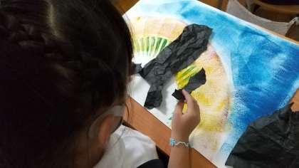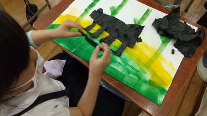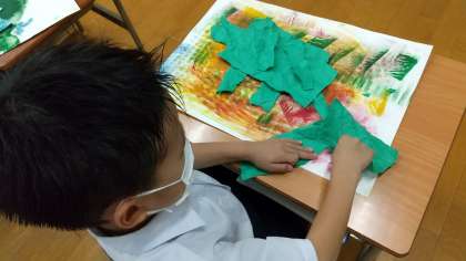 1年図工では、くしゃくしゃにした画用紙をちぎって、動物づくりをしました。前時に描いたぺったんころころの色合いや模様からイメージを広げ、思い思いの動物を表現することができました。