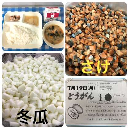 今日の給食は、さけのつけ焼き、みそ汁、とうがんの煮もの、ごはん、牛乳です。さけのつけ焼きは、さけに下味をつけ、230度のオーブンで15分間焼いています。とうがんの煮ものは、だし汁に鶏肉のうま味が加わり、しょうがの風味もきいて、とうがんが苦手な人でも食べやすかったです。