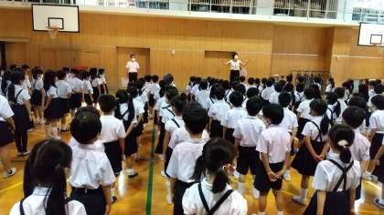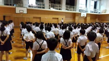 1学期の最終日。体育館にみんなが集まって終業式を行いました。みんなが集まる形での式は1年半ぶりでしたが、みんなが気持ちを引き締めて臨み、1学期の締めくくりにふさわしい式となりました。最後には、校歌の合唱を行い、2つの声部が重なり合った美しい歌声を体育館に響き渡らせました。