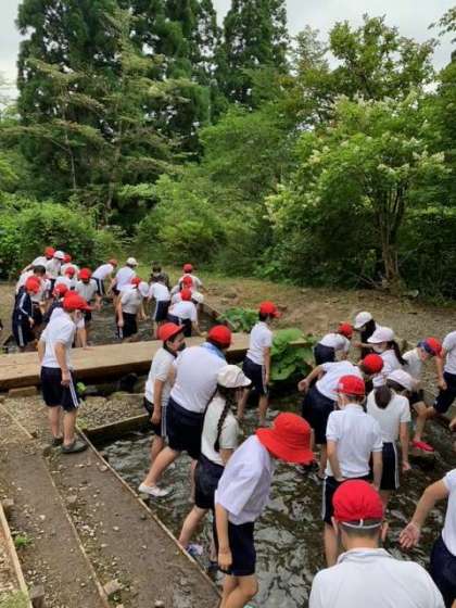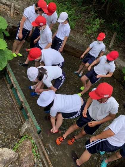 恒例の魚つかみに挑戦。全員捕獲成功。すぐに炭焼きしてもらい、いただきました。