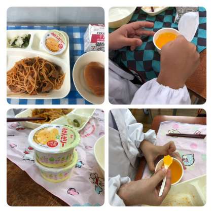 今日の給食は、イタリアンスパゲッティ、グリーンアスパラガスとキャベツのサラダ、みかんゼリー、黒糖パン(小)、牛乳です。本来は、二十世紀なしが登場する予定でしたが、天候不良により生産量が少なく、供給できないということで、みかんゼリーに変更になりました。国産みかんの果汁を使っています。おかわりをゲットし、2個積み重ねて喜んでいる児童もいました。「これはとても冷たいなぁ!!」という感想も聞かれました。シャーベット状に凍っていたものを解凍し、ほどよく解けた時に食べられるようになっています。今日も児童に人気のあるメニューでおいしく食べていました。