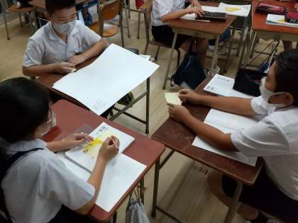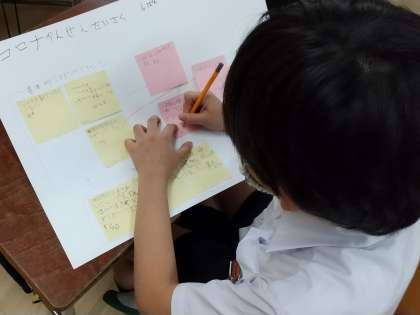 「コロナ感染対策」「低学年を支える」などグループで決めた課題について、原因と解決方法を付箋に書いて考えを出し合い、それらを繋げながら話し合うことで、話し合いを充実させることができました。