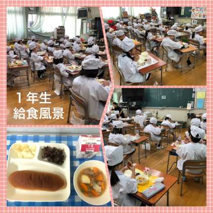 今日の給食は、牛肉の香味焼き、スープ煮、サワーキャベツ、黒糖パン、牛乳です。牛肉の香味焼きは、塩、こしょう(粗挽)、オールスパイス、ウスターソース、オリーブ油で味つけしています。今日の給食に使われている野菜は、ピーマンやたまねぎ、にんじん、グリンピース、キャベツなどで1人当たり120gの野菜をとることができます。1年生もおかわりをしたり、苦手な野菜でも少しずつ食べようとがんばったりしている姿が見られました。