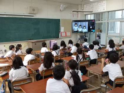 集会委員が色々な音を当てるクイズを出題。教室のみんなは、耳を澄まして聞き、何の音かを考えました。