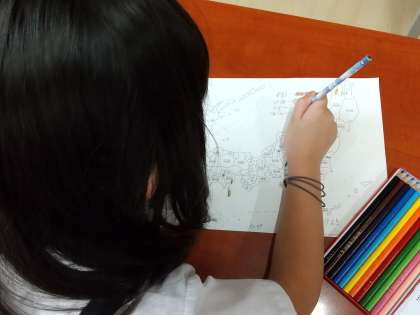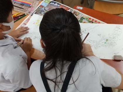 一人一人が意欲的に取り組み、広告物を隅から隅までしっかり見て探すことで、たくさんの産地を見つけました。見つけた野菜や果物を絵や言葉で白地図に書き込むと地図がどんどん埋まり、日本各地や外国など色々な所から運ばれてきていることに気づきました。