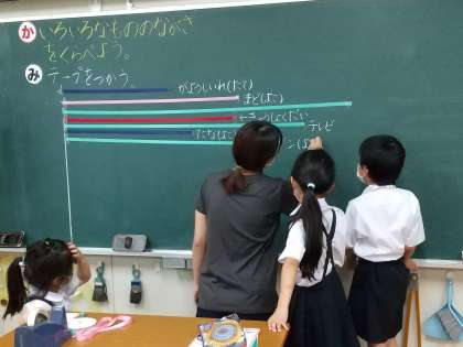 教室内にある様々なものの長さを測りとり、黒板で長さ比べ。より長いところを見つけようと、みんな一生懸命に取り組みました。