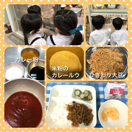 今日の給食は、大豆入りキーマカレーライス(米粉)、きゅうりのピクルス、白桃(缶)、牛乳です。キーマカレーライスのキーマとは、『細かいもの』を意味し、ひき肉を使ったカレーをキーマカレーといいます。ひき肉だけでなく、ひきわり大豆も入っています。小麦粉の代わりに、米粉のカレールウの素で味つけしています。白桃(缶)は、山形県産の白桃を使っています。