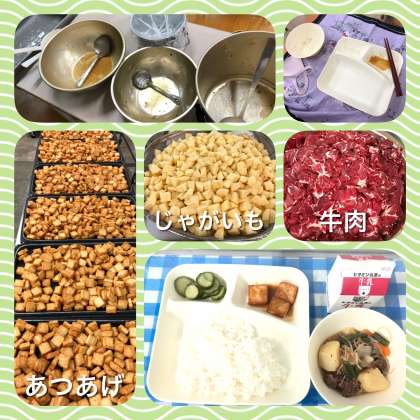 今日の給食は、肉じゃが、あつあげのみそだれかけ、あっさりきゅうり、ごはん、牛乳です。肉じゃがは、牛肉とじゃがいもを使った和食の定番メニューです。油で炒めた後にだし汁を加えて煮含めます。丁度よくじゃがいもがやわらかくなっていて、だしの味も浸みていて、ほくほく感を味わうことができました。あつあげはオーブンで焼いて、赤みそや砂糖、しょうゆなどで作ったたれをかけています。