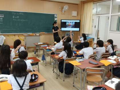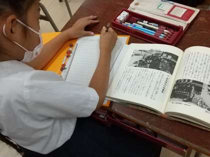 みんなで祭りの様子を写真で見たり、「わが町船場」を読みながら大事だと思うところに線を引いたりすることを通して、船場で行われるお祭りや神社に対する興味や関心を深めていました。