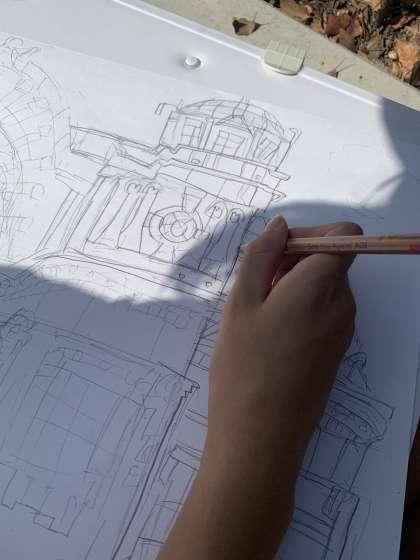 一人一人が構図を考えながら思い思いの場所を選んでスタート。細かいところまで、しっかり見ながら、丁寧に写生することができました。