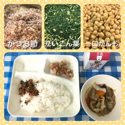 今日の給食は、鶏肉のたつたあげ、一口がんもと野菜の煮もの、おかかなっ葉、ごはん、牛乳です。鶏肉のたつたあげは、しょうが、料理酒、こいくちしょうゆで下味をつけ、片栗粉をまぶし、油であげています。煮ものは、一口がんもや野菜にだしの味がよく浸みていました。おかかなっ葉は、かつおぶしとだいこん葉をいためてふりかけにしたものです。