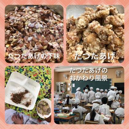 鶏肉のたつたあげは、大人気メニューです。『たつたあげ』という名前は、揚げた衣の色が赤褐色をしているので、古くからもみじの名所である奈良県の竜田川からつけられました。どの教室をのぞいても、「からあげがめっちゃおいしくておかわりした!!」「からあげがおいしいからもう食べ終わった!!」などの声が聞かれました。おかわりをめぐってはたくさんの人が並び、「揚げかすでもいいからください。」など、少しでも多く食べたいという気持ちがあふれていました。「からあげ」という言葉が学校中のいたる所から聞かれ、おいしく食べてくれてうれしい気持ちと、誰か「たつたあげ」と言ってくれる人はいないかなぁという気持ちとで複雑になりました。