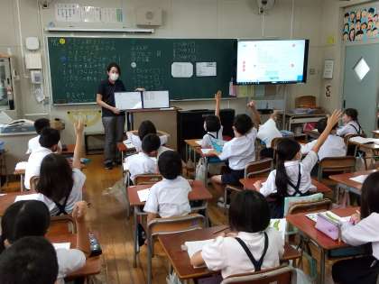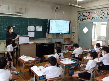 2年生算数のかけ算では、2に数をかける計算について、2とびやブロック、たし算といったこれまで学習したことを使いながら、一人一人が自分の考えたことをノートに書きました。発表ボードで考えを伝え合ったり、みんなでそれぞれの考えの似ているところに着目して話し合ったりすることを通して、かけ算のひみつに迫ることができました。