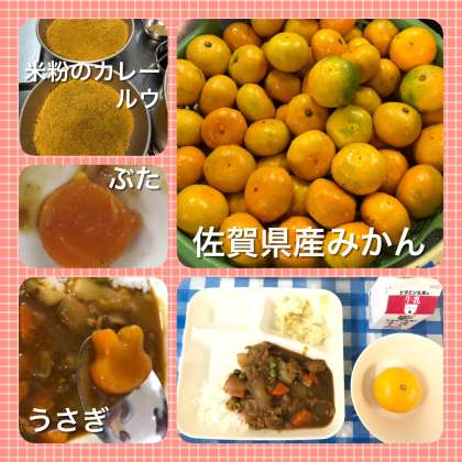 今日の給食は、ポークカレーライス(米粉)、キャベツのピクルス、みかん、牛乳です。ポークカレーライスは、米粉のカレールウの素が使われていました。みかんは、今年度初めての登場で、佐賀県産のみかんが納品されました。早い時期のみかんですが、甘くておいしかったです。ポークカレーライスには、ラッキーにんじんが入っていました。今までも星やハートの形はありましたが、今回から、うさぎや豚も加わりました。本校の給食調理員さんが20個ぐらいずつ作ってくれていました。うさぎはすぐにわかりましたが、豚は「これは猫かな?」と思っている人もいました。耳がとんがっているのが特徴です。また、これからも楽しみにしてほしいです。