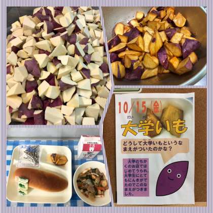 今日の大学いもは、子ども達が大好きな待ちに待ったメニューです。遠足で食べることができなかった3年生と5年生は、「今日、大学いもが食べられないのが残念だった!!」という人もおり、また、ご家庭で大学いもを作りお弁当のおかずとして入れてもらった人もいたそうです。さらに、大学いもではありませんが、同じさつまいもを使ったスイートポテトを朝早くから作っていただき、朝ごはんとして食べてきた人もいたそうです。給食の大学いもは、甘さ控えめで、とても素朴な味です。教室をのぞいてみると、「大学いもは甘すぎるから苦手やわ。」と言っていた児童も、「甘すぎなくて食べてみたらおいしかった。」と言っていました。また、黙食中で声を出すことができない給食を食べている途中のたくさんの子ども達から、おいしいという意味のOKマークをもらいました。
