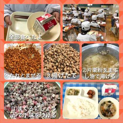 今日の給食時間に教室をのぞいてみると、「あー!!まぐろとごはんがめっちゃ合うわ。」、「まぐろがめっちゃおいしい。」「まぐろがおいしかったから、今日は全部食べられた。」など、まぐろのオーロラ煮が大好評でした。1年生は、まぐろと知らずに食べていた人、まぐろと知っていた人などいろいろで、「ミートボールかと思っていた。」、「肉かと思っていたけど、先生が魚のおかわりいる人いますかと言ったから魚だとわかった。」、「幼稚園で出たことあるから知ってた。」など、たくさんの感想が聞かれました。