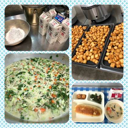 今日の給食は、はくさいのクリーム煮、あつあげのごまじょうゆかけ、豚肉とさんどまめのオイスターソースいため、おさつパン、牛乳です。クリーム煮に使われているはくさいとチンゲンサイは、長野県産が納品されました。生しいたけは、徳島県産でした。はくさいは、これからの寒くなる季節がおいしい野菜です。今日の給食の3品は、それぞれ、クリーム味、ごまじょうゆ味、オイスターソース味と、味つけがさまざまで、子ども達はいろいろな味を味わうことができました。野菜もたくさん使われていましたが、味つけが食べやすいように工夫されていたので、どのメニューもほとんど残食がなく、よく食べていました。