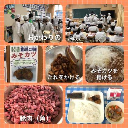 今日の給食は、みそカツ、じゃがいもと野菜の煮もの、焼きのり、ごはん、牛乳です。みそカツは、愛知県の郷土料理です。豚肉(角)に塩、こしょうで下味をつけ、衣をつけて、油で揚げています。そこに、豆みその仲間である八丁みそなどで作ったたれをかけています。