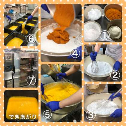 給食室で手作りしている和菓子『かぼちゃういろう』の作り方を紹介します。1.材料は、かぼちゃペースト、上新粉、砂糖、水です。2.砂糖と上新粉を混ぜます。3.そこに水を加えて混ぜます。4.かぼちゃペーストを加えます。5.すべての材料を均一になるまでよく混ぜ合わせます。6.クラスごとにバットに流し入れます。7.スチームコンベクションオーブンで30分間、蒸します。これでおいしいかぼちゃういろうのできあがりです。ご家庭でもお試しください。