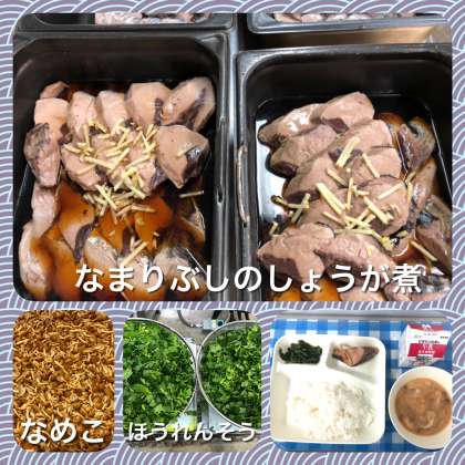 今日の給食は、なまりぶしのしょうが煮、なめこのみそ汁、ほうれんそうのごまあえ、ごはん、牛乳です。なまりぶしは、かつおを原料にして作られ、かつおの身をゆでて冷まし、骨や皮を取り除いた後、いぶして乾燥させたものです。今日は、しょうがと砂糖、みりん、こいくちしょうゆ、料理酒を合わせた調味液をかけて、オーブンで煮ています。みそ汁のなめこは、ぬめりが特徴のきのこです。ごまあえのほうれんそうは、徳島県産が納品されました。