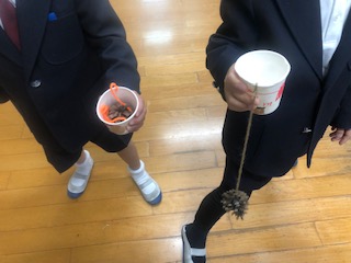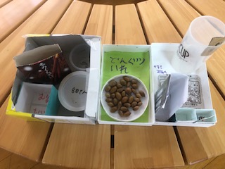 鶴見緑地で見つけたドングリや松ぼっくりを使って、おもちゃを作りました。迷路を作ったり、的当てを作ったり、楽しく活動できました。