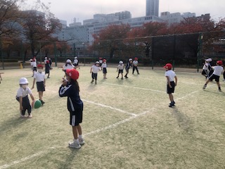 今週は火曜日や木曜日の2回、第二運動場に行きました。今までは体育館で、キャッチボールや中あての練習をしてきました。今回はズラッと並んだコートで「はしごドッジ」をしました。4人チームで外から当てたら1点、中で受けたら1点。みんな必死にボールに向かっていました。