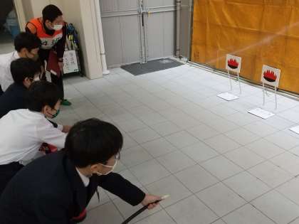 その後、水消火器体験や担架づくり、応急処置法、水バケツリレーをグループごとに体験しました。