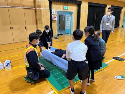 4年生では、中央消防署の方々に来ていただいき、防災について様々な体験を通して学びました。