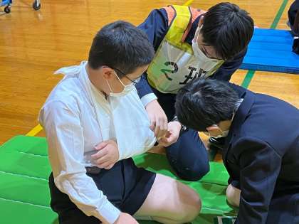 応急処置法では、腕を骨折したことを想定して、三角巾や段ボール、スーパーの袋を利用した固定法を体験しました。