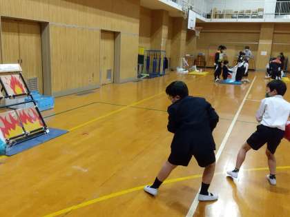 水バケツリレーでは、グループの友達と素早く消火する方法を考え、協力して活動できました。