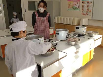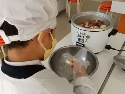 コロナウイルス感染症対策のため、ビニル手袋をして、一人一人炊飯器に芋を入れていきました。ほんの一瞬ずつでしたが、芋の様子や固さをしっかり観察していました。