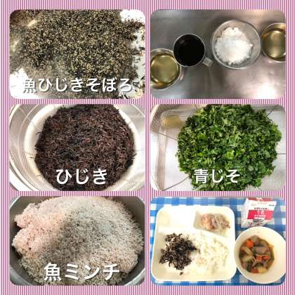 今日の給食は、鶏肉のゆず塩焼き、含め煮、魚ひじきそぼろ、ごはん、牛乳です。魚ひじきそぼろは、新食品の魚ミンチを使っています。魚ミンチは、スケソウダラから作られます。料理酒で下味をつけた魚ミンチをサラダ油でいため、ひじきを加え、砂糖、みりん、うすくちしょうゆで味つけし、最後にしそを加えていためます。いためていると、魚ミンチのスケソウダラから水分が出てくるので、しっかりいためて水分をとばします。この水分をとばす調理をしっかりしておかないと、魚の生臭さが残ったそぼろになります。本校の給食調理員さんが水分をとばしながら調理して、生臭さのないおいしい魚ひじきそぼろができあがりました。ごはんがよく進む一品でした。