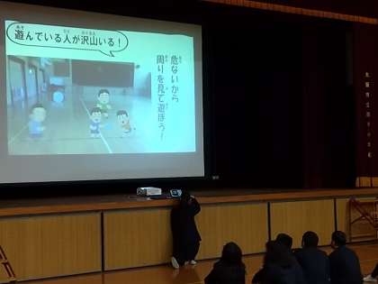 朝会で、保健委員会の発表がありました。学校の中の危険なところを写真や映像で伝え、安全に過ごせるように呼びかけました。