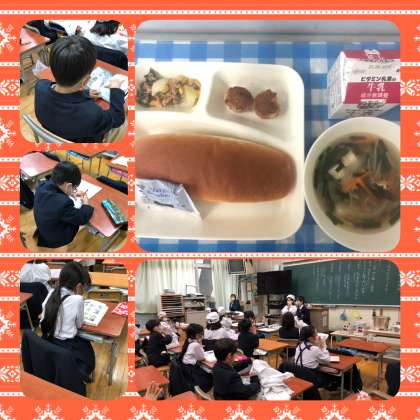 今日の給食は、あげシューマイ、とうふのスープ、ツナとチンゲンサイのいためもの、コッペパン、ブルーベリージャム、牛乳です。あげシューマイは、外はカリッと、中は肉汁がジューシーに揚がっていて、子ども達にとても好評でした。いためものは、ツナを使っていることで野菜が食べやすく、いつも残食がほとんどありません。今回もよく食べていました。給食を食べ終わってから、本を読んだり、自由帳に絵を描いたりして、時間を過ごしている1年生の様子を見ることができました。給食時間終了の5分前でもほとんどの人が食べ終わることができていました。