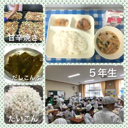 今日の給食は、鶏肉の甘辛焼き、みそ汁、だいこんの煮もの、ごはん、牛乳です。鶏肉の甘辛焼きは、鶏肉に料理酒や砂糖、みりん、こいくちしょうゆなどで下味をつけ、たまねぎと混ぜ合わせてオーブンで焼きます。煮もののだいこんは、長崎県産が納品されました。だしで煮て、片栗粉でとろみをつけています。