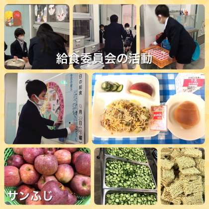給食委員会の活動として、給食の後片付けの手伝いがあります。食器や食缶の返却場所を声かけしたり、パン箱の中にパンばさみや残ったパンが入ったままになっていないかを確認したり、空の牛乳パックが入ったケースを片付けたりしています。また、栄養ボードに次の日の献立を記入したりしています。このように、5、6年生になると、委員会活動があり、学校全体の仕事もします。給食当番が給食の決まりを守って給食を返却する、それを給食委員会の児童が確認するという流れで、毎日の給食の後片付けが行われています。