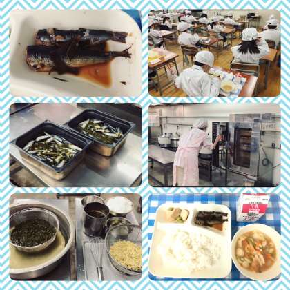 今日の給食は、いわしのしょうが煮、みそ汁、高野どうふの煮もの、ごはん、牛乳です。しょうが煮は、ミニバットにいわしとしょうゆや酢、砂糖などの調味液、こんぶ、しょうがなどを入れ、250度のオーブンで30分間煮ています。1人2尾ずつで、骨ごと食べられるほどやわらかく煮られていましたが、子ども達は細かく骨をとり、食べるのに時間がかかっていました。みそ汁や高野どうふの煮ものは、だしの味がよく浸みていました。