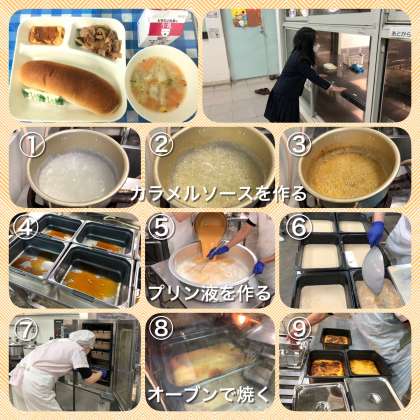今日の給食は、豚肉のケチャップソテー、コーンスープ、焼きプリン、コッぺパン、ソフトマーガリン、牛乳です。焼きプリンは、給食の手作りデザートの一つです。湯と砂糖を褐色になるまで煮詰め、カラメルソースを作り、ミニバットに敷きます。鶏卵と牛乳、クリーム、砂糖を混ぜ合わせてプリン液を作ります。ミニバットにプリン液を流し入れ、180度のオーブンで25分間、蒸し焼きにします。カラメルソースを作り始めてからプリンが焼きあがるまで1時間以上かかります。とても時間のかかるデザートですが、甘い味付けが苦手な人もいました。しかし、今日は給食最終日で、給食調理員さんの熟練の技を見ることができました。
