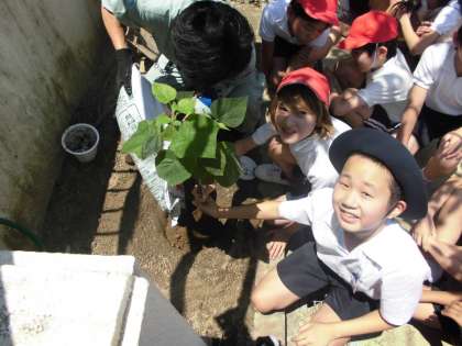 先日来訪してくださった鈴木京香さんが記念としてくださったものです。映画「おかあさんの木」の中で主人公のおかあさんが、戦地へ行く息子たち一人一人の代わりとして植えたのが桐の木で、息子たちが生きて帰ってくるようにという願いのこもったものでした。児童一人一人がそのおかあさんの平和への思いを胸に、大切に大切に育てて欲しいと思います。