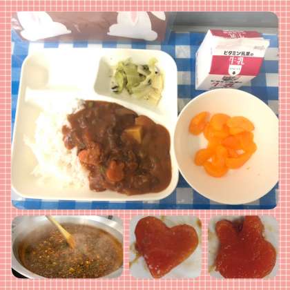 今日の給食は、ハヤシライス、キャベツのひじきドレッシング、みかん(缶)、牛乳です。ハヤシライスは、給食室で小麦粉と綿実油を使ってルウを手作りしています。ラッキーにんじんも入っていて喜んで食べていました。うさぎのラッキーにんじんが入っていた児童が、周りの友達から「うさぎのラッキーにんじん、かわいい!!」と言われていました。みかん缶も大人気で、「いっぱいおかわりした。」と知らせてくれました。1年生では、初めて全員が残すことなく、時間内に完食することができたということで、「初めて記念日だ!!」とみんなでお祝いしていました。