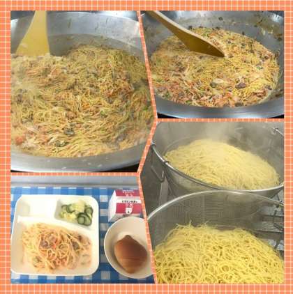 今日の給食は、さけのクリームスパゲッティ、キャベツときゅうりのサラダ、黒糖パン(小)、牛乳です。クリームスパゲッティは、紅ざけ(フレーク)を使い、クリームソースを小麦粉、サラダ油、牛乳、クリームを使って給食室で手作りしています。本校の370人分のスパゲッティを作るのに、大きな釜を2釜使って炒めています。