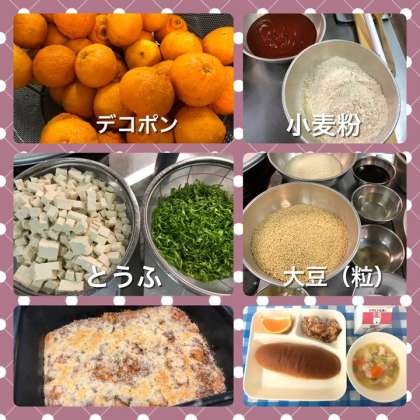 今日の給食は、とうふのミートグラタン、押麦と野菜のスープ煮、デコポン、黒糖パン、牛乳です。ミートグラタンは、給食室で小麦粉をからいりしてブラウンルウを手作りしています。牛ひき肉の量を減らし、大豆(粒)を使うことで、脂っこくならないようにしています。ケチャップやトマトピューレ、ウスターソースなどで味つけしています。デコポンは、和歌山県産が納品されました。甘くて果汁がたっぷりでした。