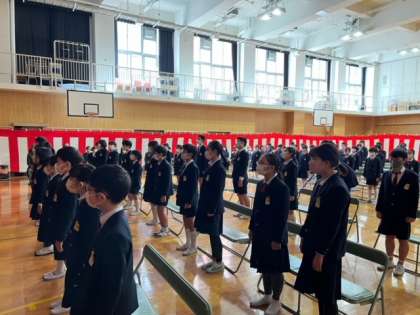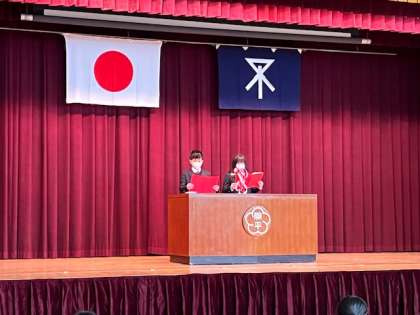 多くの人が集まって行うことができないため、5、6年生による会を体育館で実施し、1〜4年生は教室で映像中継を視聴して、お祝いしました。また、数を絞ってお招きした地域の方々にも、開平ホールで映像中継を見ていただきました。