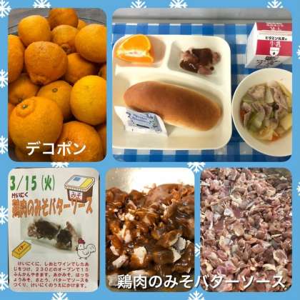 今日の給食は、鶏肉のみそバターソース、洋風煮、デコポン、コッペパン、ブルーベリージャム、牛乳です。みそバターソースは、赤みそ、八丁みそ、砂糖、バター、湯を混ぜあわせてソースを作り、オーブンで焼いた鶏肉にかけています。デコポンは、和歌山県産が納品されました。甘酸っぱくて果汁も多く、子ども達はおいしく食べていました。