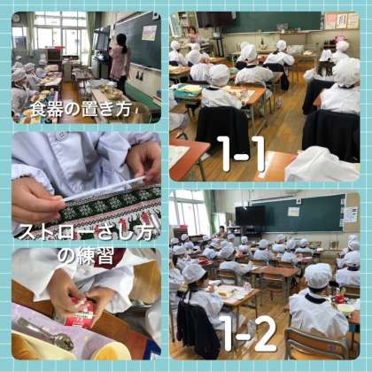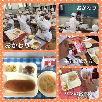 今日の給食は、豚肉のデミグラスソース、スープ、キャベツとコーンのソテー、黒糖パン、牛乳です。今日は、新学期の給食2日目です。昨日に引き続き、今日も1年生は担任の先生に様々なことを教わりながら給食時間を過ごしていました。食器の置き方(パンが入っている方を手前に置く)、再度、牛乳パックのストローのさし方(ストローの袋の開け方・ストローの先がとんがっている方をさす)、パンの食べ方(のどにつまらないように一口ずつちぎって食べる)、底に残っている牛乳を飲む方法(牛乳パックをかたむけると最後まで飲むことができる)などです。おかわりもたくさんの人が手をあげていました。食べている時は黙食です。今日の1年生はできることが増え、昨日ははじめてで時間がかかっていたことでも、とても上手になっていたので、これからますますよりよい方法を身につけていく姿を見ることができると思います。