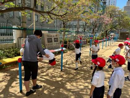 自分のチャレンジしたい高さを選んで前回りをしました。苦手意識のある子も、担任の先生に補助してもらいながら挑戦してみることで、少しずつ楽しんで回れるようになりました。
